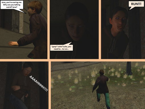"Stop," Randy rasped as he felt pressure blocking his airways. "I... I surrender." Scarlet's grip tightened blocking off any air. "I... I give." James stared in shock. He saw Scarlet's mouth curl into a grin as she continued to squeeze the life from Randy."Wait!" James shouted, suddenly rushing up to Scarlet. "What are you doing?"