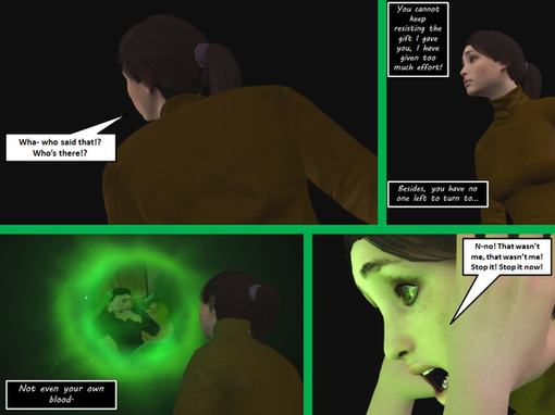 "Who are you?" Lady Necro said forcefully turning Raven to face her, cutting her cheek with her fingernail in the process, causing Raven to gasp in pain. Again, Raven didn't answer as she struggled to move. Lady Necro suddenly grabbed Raven's wrist and forced her arm up against the wall revealing the pentegram. Raven grimaced the mark burned her skin.