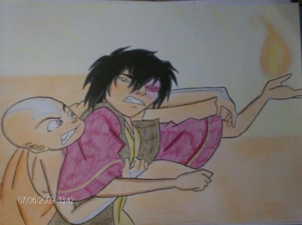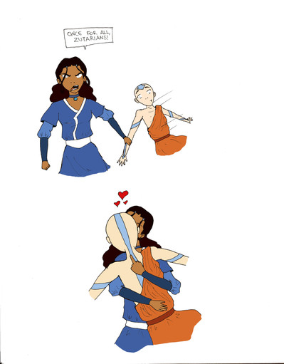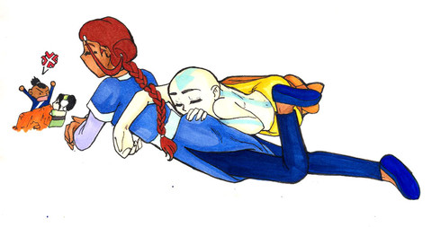Poor Aang is being strangled by Toph.