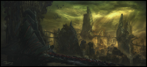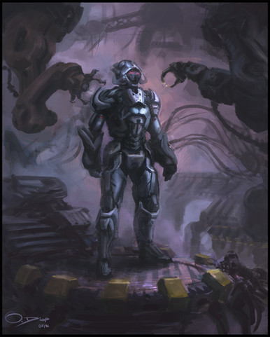 @ Areoseph. Well!! I was kind learning on this one. I started over a previous sketch painting, and worked in abstract way doodling until to get a feeling. Also I laid down a pers grid on a layer, and spent time to figure out my final comp and some shapes. It still some stuff that I wasn't really happy, but you know to a point you have to let go and move on.