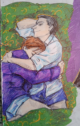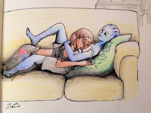 Aaaaawwwww I'm melting, this is so lovely and sweet. I would love to make a rendered version of your drawing, sadly I never seen a nice poseable blanket, which adds that intimate and warm feeling detail on the picture. I like the little details added here like the small photograph and CD,s on the chimney.