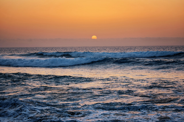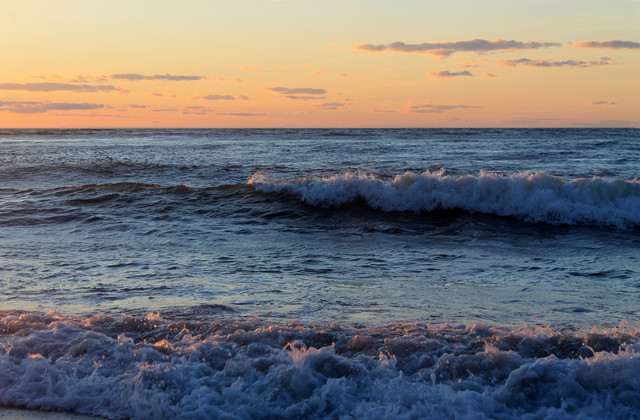 beautiful colours in the sky and the waves crashing in. Lovely scene