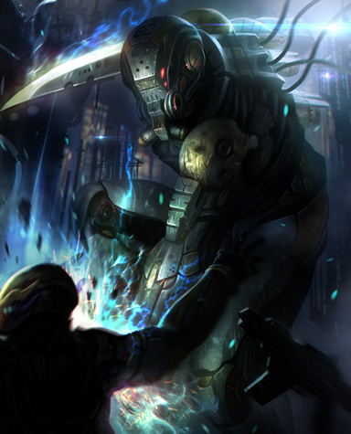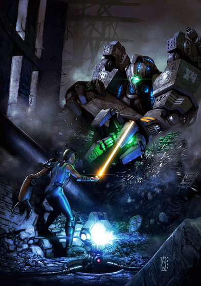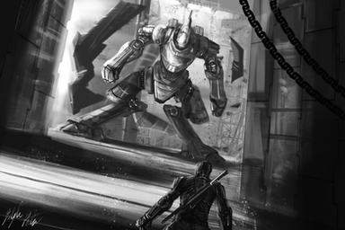 Don't know the game, but this is a great action piece. Your knight is braced for action, the (robot?) is just barreling down the alley at him...whew!
