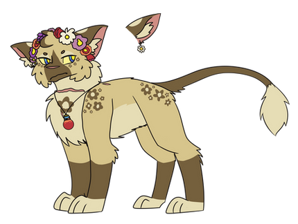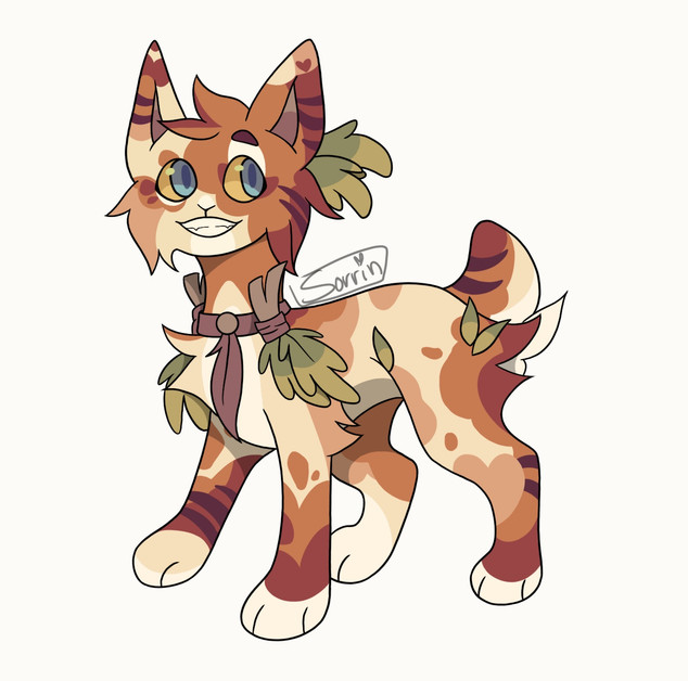 a thing i did liiiiike, a few months ago? it’s not that old but it isn’t recent. it was a pretty experimental piece that i did. while still trying to figure out a method for lineart and shading. i think i’ve figured out lines but i STILL have problems with shading tbh 😭anyway, this was also done to design some extra little accessories dandelionpaw has! he likes to collect and carry plants, especially flowers, as well as bugs :]