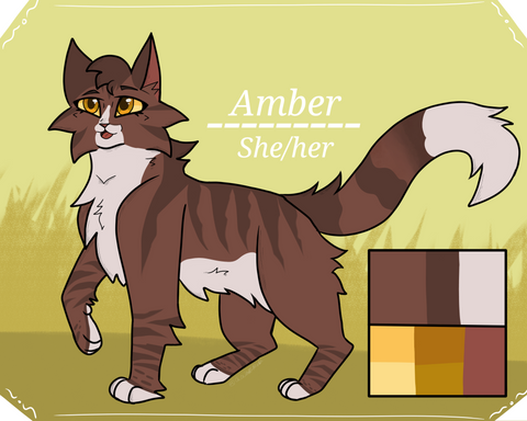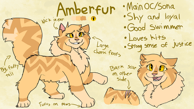 wow! similar to my own kind of Aberstar to! he is a leader ( of course because his name ends with star) hes a dark orange tabby with a scar on his lip, shoulder, and tail. also both of his ears are torn. ( he has amber eyes)