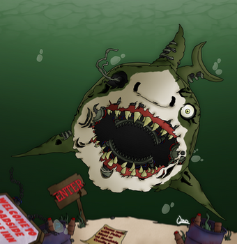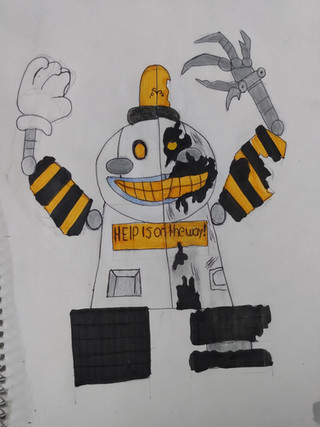 En este dibujo quise retratar una escena donde Happs persigue y está a punto de aplastar a alguien (la silueta negra que está junto al brazo izquierdo). Tomé una perspectiva de tunel y al robot mirando a su víctima de forma imponente pero a la vez que se vea la locura en su rostro tal como se ve en la portada. En el fondo añadí algunos posters y carteles de SB junto a algunas cajas y el suelo rodeado por líneas de seguridad, indicando que esta es una área peligrosa, el lugar menos agradable en el que te gustaría estar junto al robot Happs.