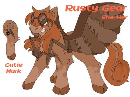 Personality: Rivet is an over-excited-about-technology mare. She's very sweet, but when she gets her head into a project, she doesn't come out until it's finished, and that means she gets very stressed and into the work. She works so hard sometimes that she completely misses anything said to her while working. She tends to not sleep for a few days on end when she's got a project, whether it's just a simple sketch for a plan or whether it's a large-scaled project. It must be perfect. She also fights for equal rights. She does not believe in the separation and inequality of the genders, and she is a strong supporter and fighter for those rights.