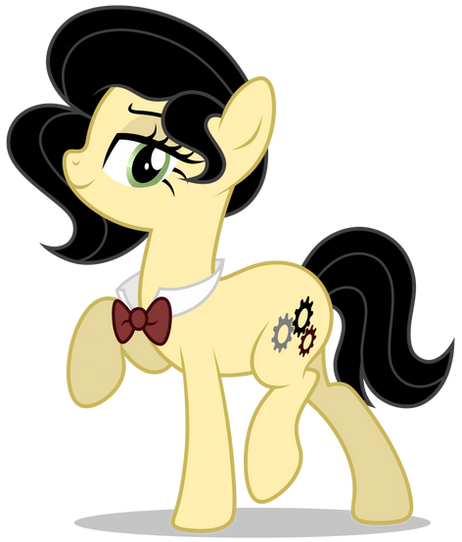 Written Appearance: Rivet has a sandy-coloured coat with a voluminous black mane. She has large, light mint-green-ish eyes. She always wears a dark red bow tie that matches the red gear on her cutie mark. Her cutie mark consists of three gears that are dark red, grey, and black.