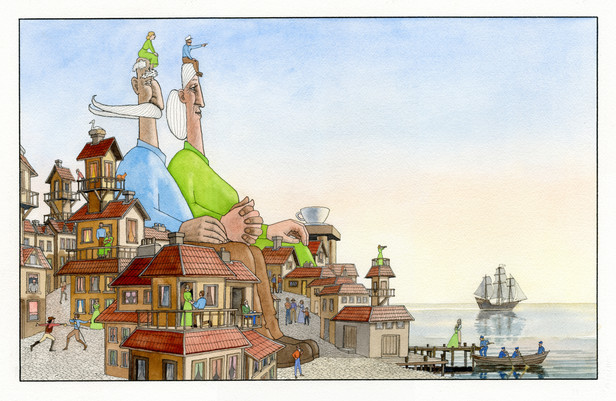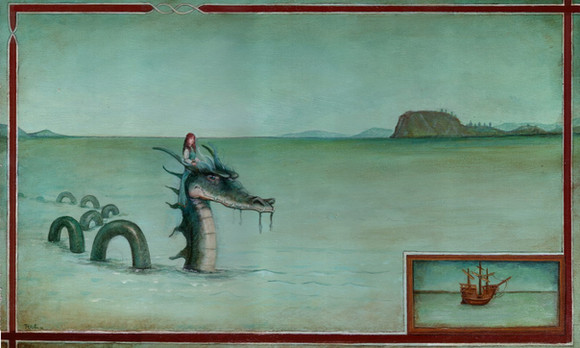Amazing piece of art work, love the fish and the giant with the boat on his head.