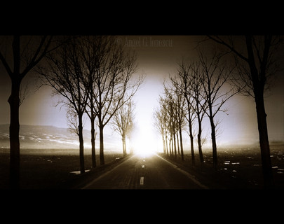 The lighting creates an incredible atmosphere. Especially with the purple ting, very eerie and foreboding. The line of trees creates great depth, and makes the road seem endless as they continue far into the distance. Great perspective. I'm not sure if perhaps the black at the top of the photo is too dark. It irritates me how I can't see the top of the trees.