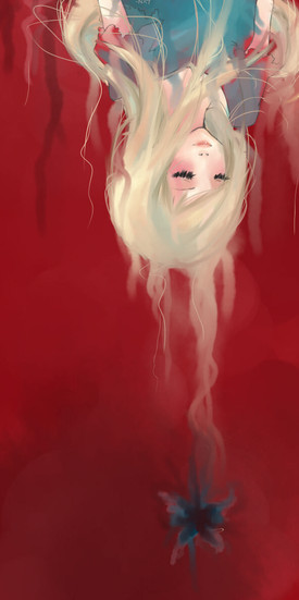 WOW Wow wow, I'm enthralled by the colours in this! The severed head and red streaks of spilled blood, and the new-growth tree and pure cotton-white flowers and blossoms paint a very strong contrast between life and death. And yet, at the same time, all those details bring these two extremes together like the ying and yang they always will be.