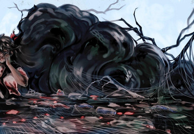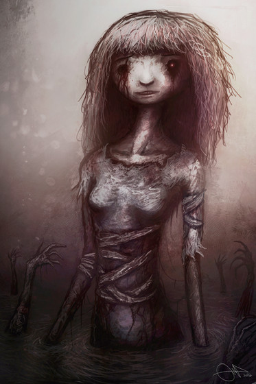 I love how you captured the look of melting and of sticky, tarry, oiliness so well. There's a certain waxiness to her as well in the way she is melting. All the bubbles just look so.. thick and tangible, like I could reach out and pop one from right here. I'm not sure if I can explain exactly why, but I love the little details of the holes/bubbles in her body, as if the dissolution is spreading and eating its way out from inside...