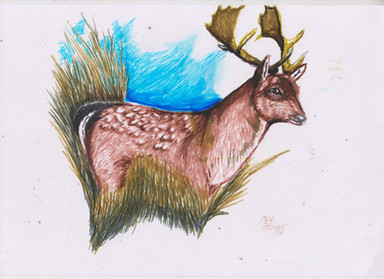 Cerf réalisé avec de l'aquarelle, de l'acrylique blanche et jaune, un feutre noir et un feutre blanc~3h