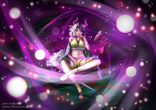 What is that??? It differs so much from your other drawings. Radiant colors, lots of hues despite the main color being purple, complicated lighting/shadowing, a lot of detail... Great job! Quite a sight to behold!