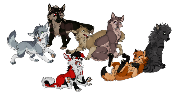 Flat color commission for lalili067 I did some weeks ago of the 4 wolves from her fan fiction.From left to right : Calcifer, Sasori, Randy & Frost.