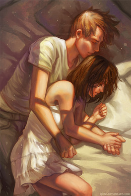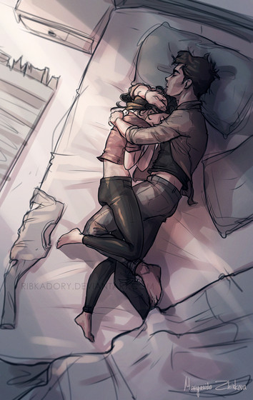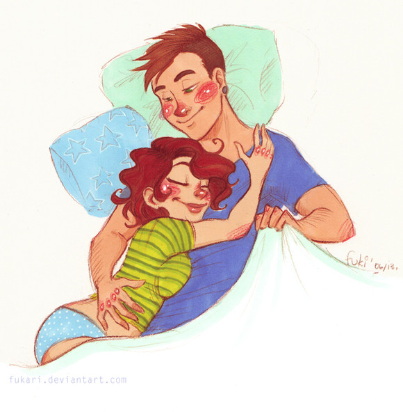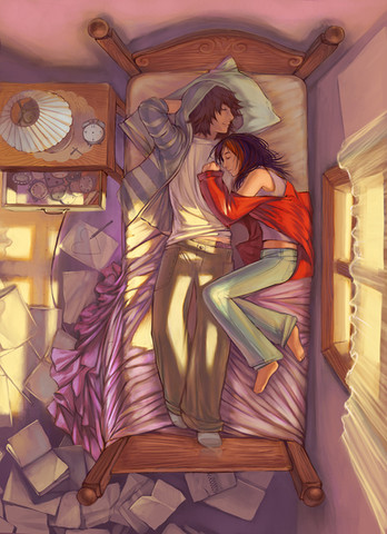 I love the sun's rays cresting upon the bed, and the way he's deep in sleep and she's blissfully holding him close, pressed up against his back and one leg hooked around his thigh. It's something very intimate, and very sweet, and very poetic.