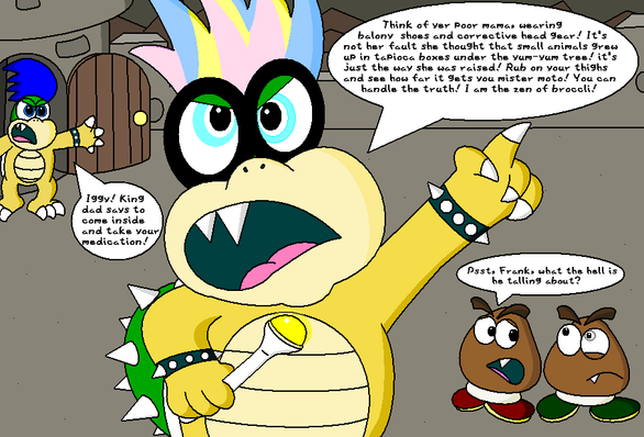 Bowser Jr.'s such a jerk! Β Yeah, but it was a kick in the face when we all found out that the Koopalings weren't Bowser's children.