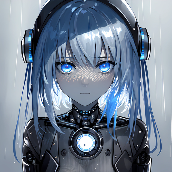 Prompt: portrait of (android) 1girl in cyberpunk city, raining, melancholy, sad, ((mechanical_parts)), (((robot_joints))), (cyborg), (grey_skin), mechanical_eyes, glowing_eyes, (science fiction), solo, colorful, (official art), fantasy, masterpiece, best quality, (highres), absurdres, 4K, 8K, 16K, beautiful face, beautiful body, symmetrical face, gorgeous, deep eyes, realistic shaded, stunning, intricate, hyper-detailed, highly detailed, sharp, smooth, sharp focus, realistic, anime, mangaWidth: 768