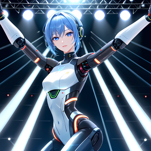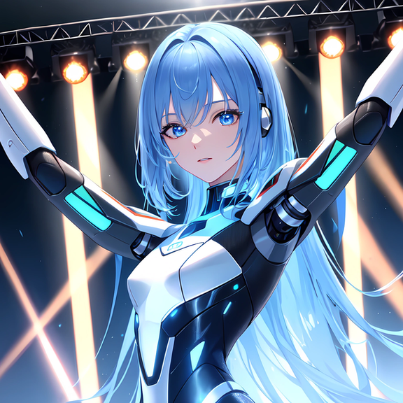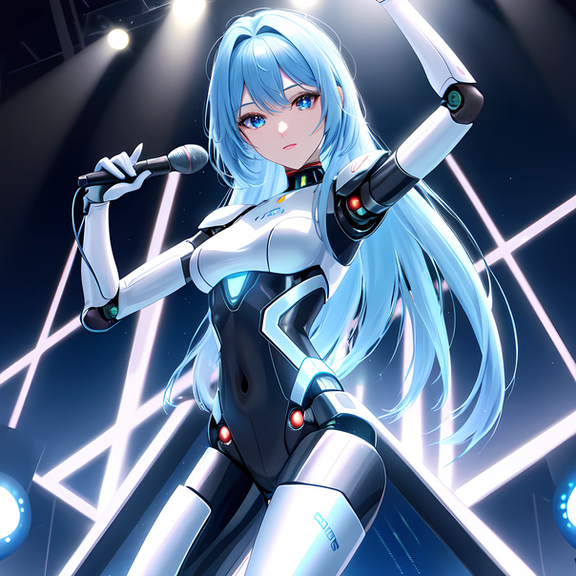 Prompt: idol+, humanoid_robot, stage+, singing, holding_microphone+, robot_joints+, android, solo, crowd, cyborg+, colored_skin, grey_skin, mechanical_eye, glowing_eye, masterpiece, highres+, absurdres, 4K, 8K, 16K, hyper-detailed, deep eyes, stunning, intricate, sharp, smooth, realisticNegative Prompt: greyscale, large_breasts, loli, simple_background, cartoon, 3d, heterochromia, ugly, fat, obesity, chubby, deformed, deformity, ugliness, blurry, disfigured, poorly drawn face, mutation, mutated, extra_limb, extra limbs, bad hands, wrong hands, poorly drawn hands, messy drawing, text, cropped head, bad anatomy, two heads, child, kid, gross, mutilated, disgusting, horrible, old, conjoined, lowres, extra digit, fewer digit, worst quality, low quality, jpeg artifacts, watermark, username, artist name, censored, error, missing fingers, cropped, normal quality, signature, b&w, weird colors, bad art, poorly drawn