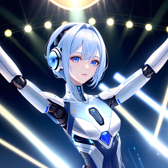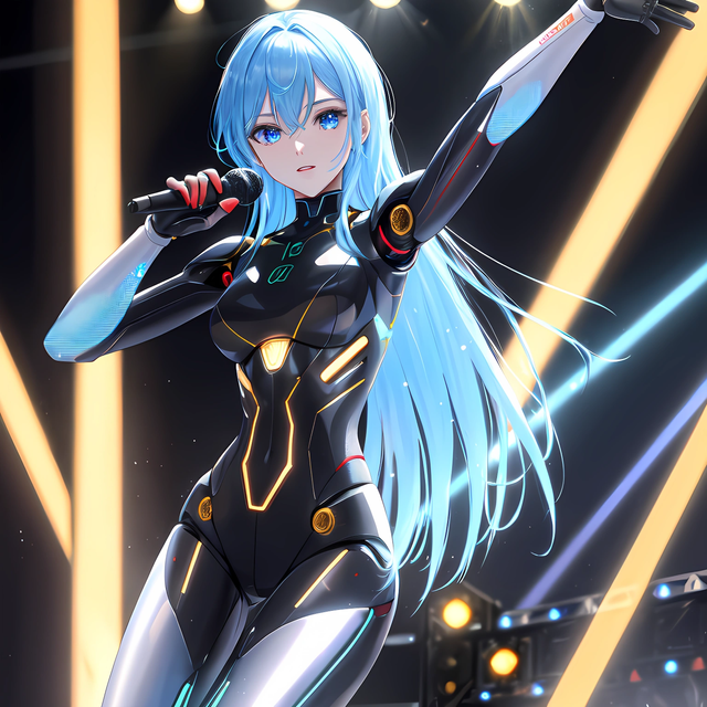 Prompt: idol+, humanoid_robot, stage+, singing, holding_microphone+, robot_joints+, android, solo, crowd, cyborg+, colored_skin, grey_skin, mechanical_eye, glowing_eye, masterpiece, highres+, absurdres, 4K, 8K, 16K, hyper-detailed, deep eyes, stunning, intricate, sharp, smooth, realisticNegative Prompt: greyscale, large_breasts, loli, simple_background, cartoon, 3d, heterochromia, ugly, fat, obesity, chubby, deformed, deformity, ugliness, blurry, disfigured, poorly drawn face, mutation, mutated, extra_limb, extra limbs, bad hands, wrong hands, poorly drawn hands, messy drawing, text, cropped head, bad anatomy, two heads, child, kid, gross, mutilated, disgusting, horrible, old, conjoined, lowres, extra digit, fewer digit, worst quality, low quality, jpeg artifacts, watermark, username, artist name, censored, error, missing fingers, cropped, normal quality, signature, b&w, weird colors, bad art, poorly drawn