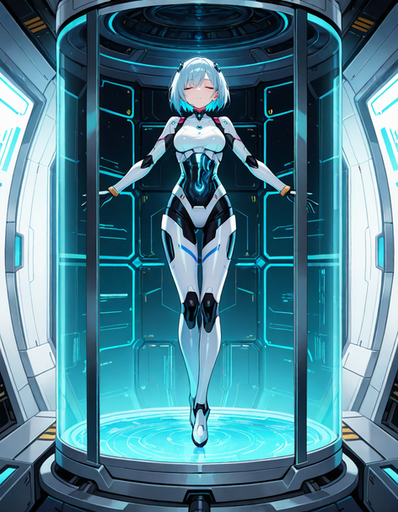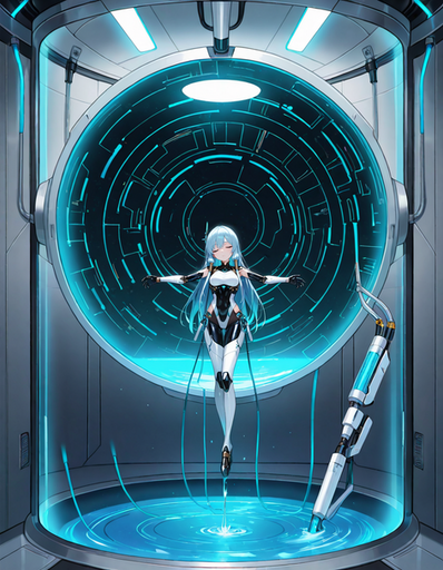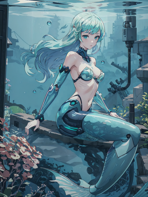 Prompt: 1girl, humanoid_robot+, cultivation_tank, in_container, underwater, robot_joints+, solo, radio_antenna, android, cyborg+, grey_skin, colored_skin, pale skin, glowing eyes, indoors, masterpiece, highres+, absurdres, 4K, 8K, 16K, hyper-detailed, deep eyes, stunning, intricate, sharp, smooth, realisticNegative Prompt: mecha, gundam, large_breasts, nsfw, greyscale, loli, simple_background, cartoon, 3d, heterochromia, ugly, fat, obesity, chubby, deformed, deformity, ugliness, blurry, disfigured, poorly drawn face, mutation, mutated, extra_limb, extra limbs, bad hands, wrong hands, poorly drawn hands, messy drawing, text, cropped head, bad anatomy, two heads, child, kid, gross, mutilated, disgusting, horrible, old, conjoined, lowres, extra digit, fewer digit, worst quality, low quality, jpeg artifacts, watermark, username, artist name, censored, error, missing fingers, cropped, normal quality, signature, b&w, weird colors, bad art, poorly drawn