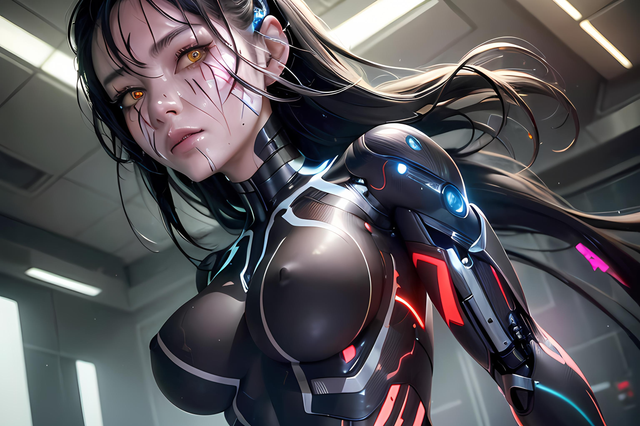 Prompt: 1girl, humanoid robot, robot_joints+, robot, android, human face, cyborg+, elysium, carbon fiber, wiring, exposed machinery, artificial muscle, metal fingers, grey_skin, colored_skin, pale skin, radio_antenna, glowing eyes, solo, masterpiece, highres+, absurdres, 4K, 8K, 16K, hyper-detailed, deep eyes, stunning, intricate, sharp, smooth, realisticNegative Prompt: antenna hair, mecha, gundam, large_breasts, nsfw, greyscale, loli, simple_background, cartoon, 3d, heterochromia, ugly, fat, obesity, chubby, deformed, deformity, ugliness, blurry, disfigured, poorly drawn face, mutation, mutated, extra_limb, extra limbs, bad hands, wrong hands, poorly drawn hands, messy drawing, text, cropped head, bad anatomy, two heads, child, kid, gross, mutilated, disgusting, horrible, old, conjoined, lowres, extra digit, fewer digit, worst quality, low quality, jpeg artifacts, watermark, username, artist name, censored, error, missing fingers, cropped, normal quality, signature, b&w, weird colors, bad art, poorly drawn