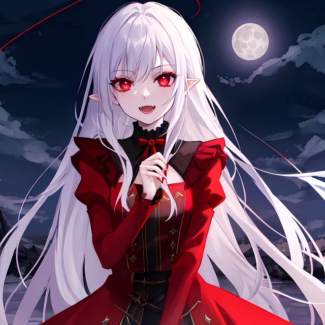 Prompt: ((vampire)), 1girl, solo, (fangs), red_eyes, pointy_ears, pale_skin, slit_pupils, outdoors, night sky, full moon, antasy, masterpiece, (highres), absurdres, 4K, 8K, 16K, hyper-detailed, deep eyesNegative Prompt: head_fins, head_wings, bat_ears, animal_ears, bat_wings, wings, large_breasts, loli, simple_background, cartoon, 3d, ugly, fat, obesity, chubby, deformed, deformity, ugliness, blurry, disfigured, poorly drawn face, mutation, mutated, extra_limb, extra limbs, bad hands, wrong hands, poorly drawn hands, messy drawing, text, cropped head, bad anatomy, two heads, child, kid, gross, mutilated, disgusting, horrible, old, conjoined, lowres, extra digit, fewer digit, worst quality, low quality, jpeg artifacts, watermark, username, artist name, censored, error, missing fingers, cropped, normal quality, signature, b&w, weird colors, bad art, poorly drawn