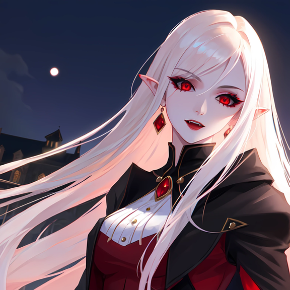 Prompt: vampire+, 1girl, fangs, black sclera, colored sclera, slit_pupils, red_eyes, pointy_ears, pale_skin, solo, crowd, night, full moon, outdoors, castle background, masterpiece, (highres), absurdres, 4K, 8K, 16K, hyper-detailed, deep eyes, stunning, intricate, sharp, smooth, realisticNegative Prompt: head_fins, head_wings, bat_ears, animal_ears, bat_wings, wings, nsfw, greyscale, loli, large_breasts, simple_background, cartoon, 3d, heterochromia, ugly, fat, obesity, chubby, deformed, deformity, ugliness, blurry, disfigured, poorly drawn face, mutation, mutated, extra_limb, extra limbs, bad hands, wrong hands, poorly drawn hands, messy drawing, text, cropped head, bad anatomy, two heads, child, kid, gross, mutilated, disgusting, horrible, old, conjoined, lowres, extra digit, fewer digit, worst quality, low quality, jpeg artifacts, watermark, username, artist name, censored, error, missing fingers, cropped, normal quality, signature, b&w, weird colors, bad art, poorly drawn