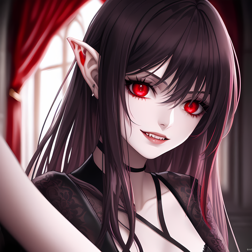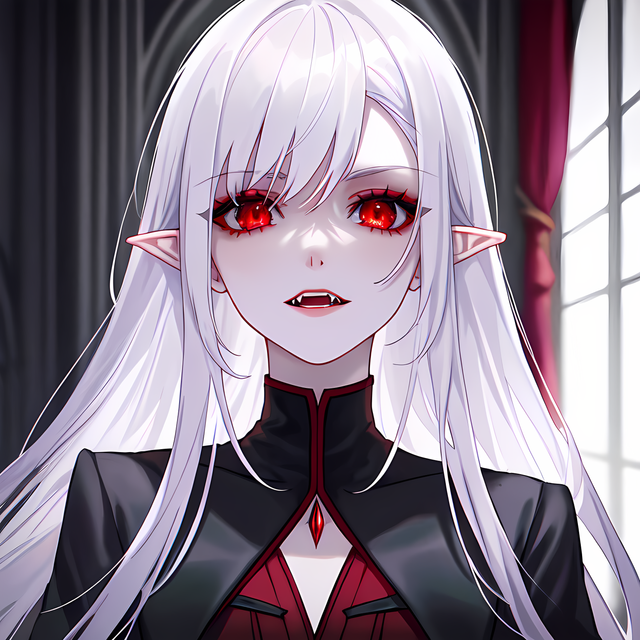 #pointyears #vampire #vampiregirl #vampirelady #whitehair #whitehairedgirl #red_eyes #white_hair #generatedart #pointy_ears #ai_art #ai_generated #ai_generated_art #stablediffusion #promptincluded #anythingv4