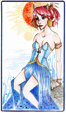 That's a really neat coloring. Were you using copic (or some other) markers? Also I love the fact she's blue. The orange cloak and background make a nicely balanced contrast for her and her clothing.