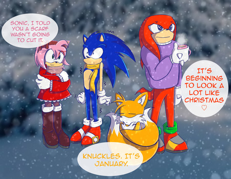 Cute outfits!Β Sonic finally bundled up in something more than just a scarf.Β I wonder if Amy talked him into it.