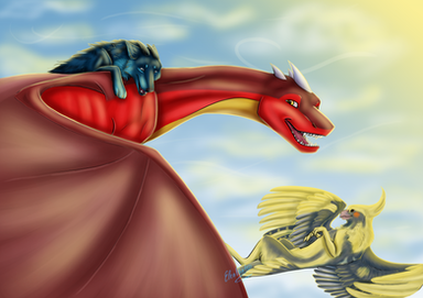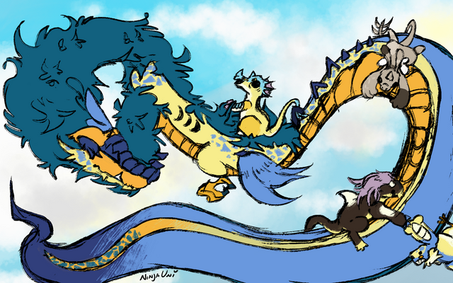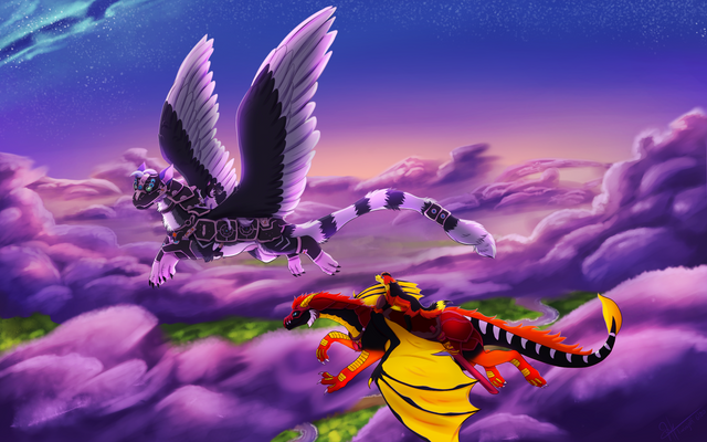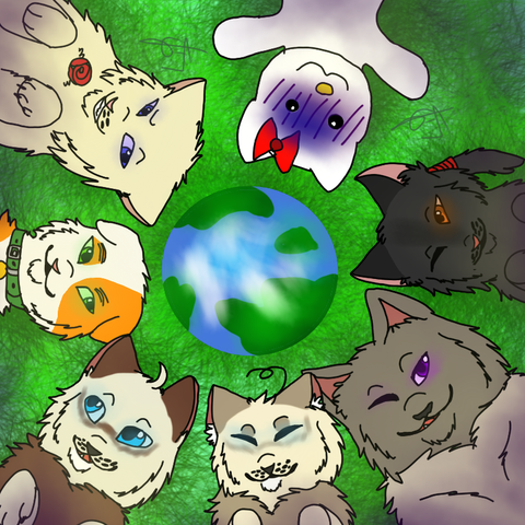 Just some of my ocs messing around.The dragon is lily, the white wolf is Romulus , the gray cat is emett, the wolf is edyess, the dog is CD, and the winged cat thing is Chetu.