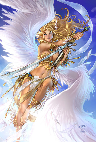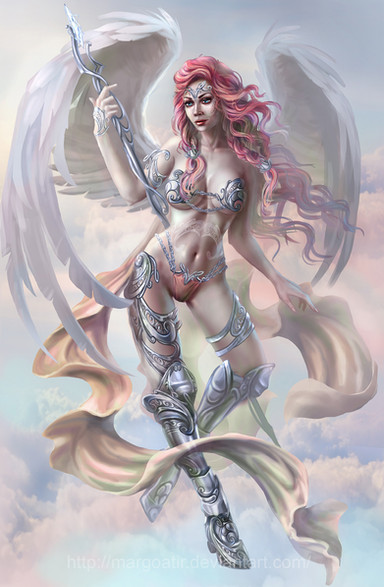 Beautiful! I like how the radiant light gives us a journey from yellow to blue in the background. Her wings are beautiful and pure too. Really awesome no matter where you look