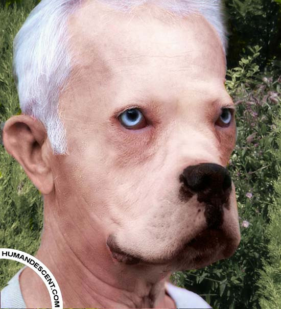 Amazing concept. The cute little doggie face offsets the creepiness of the undernourished body and kind of malformed human face perfectly.