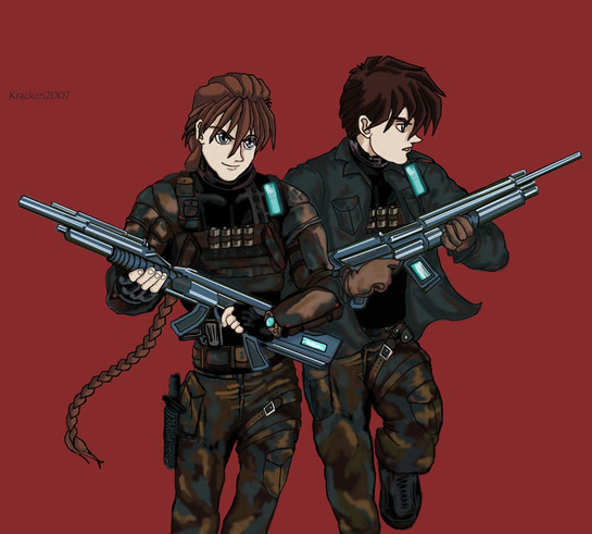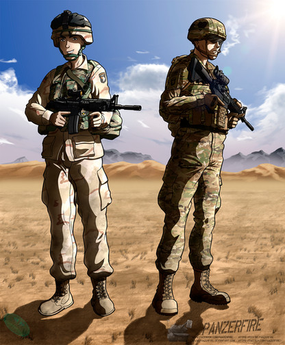 Both with USMC combat uniforms (On desert MARPAT) and holding Colt M4s with EOTechs. Ditta's M4 has a M203 Grenade Launcher (Although while drawing it I was contemplating adding it the newer M320 GL, however I lacked of the reference to draw it).