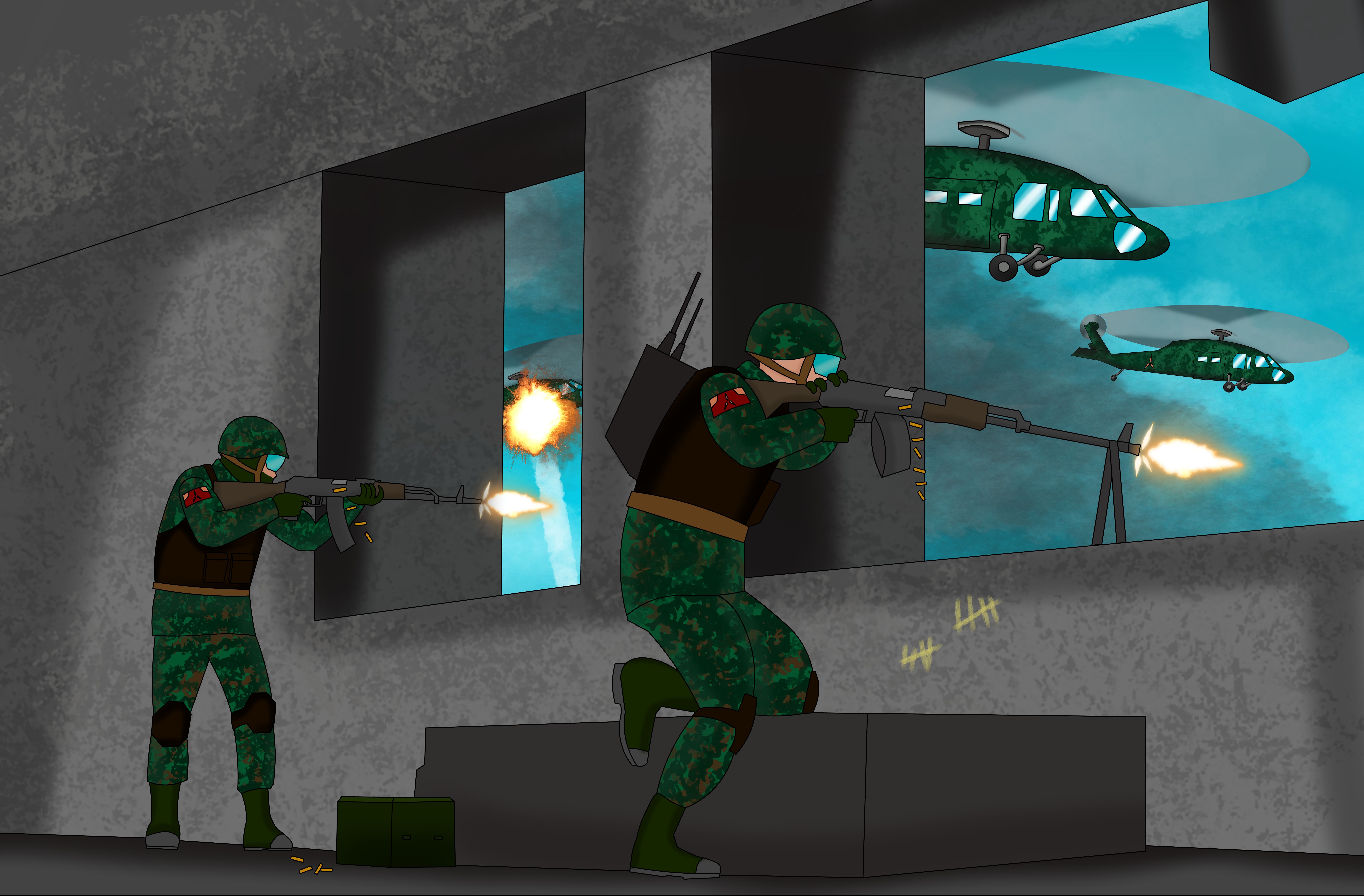 Two soldiers are using the Kbs wz. 1996 Beryl rifle with EOTechs (Note that because of my ignorance about these laser sights I forgot to draw the damn laser pointers