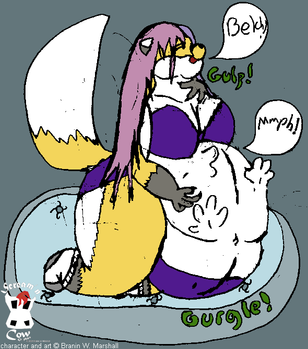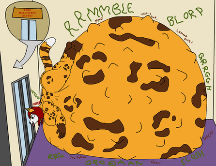 Ahhh, thank you! I really worked hard on it...yeah, this was my first time trying such a scene, but I worked hard on it--the table legs are actually not on the floor; they flew upward as her gut smashed down the centre, though I should have made the legs longer. True, should have made the one breast more curved...and yes, she was supposed to be double-chinned. XD (Though, as she's quite muscly besides the gut, I figured it wouldn't have wobbled...though that's no excuse for forgetting ass jiggle.)