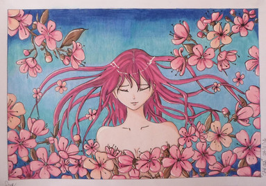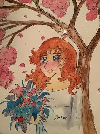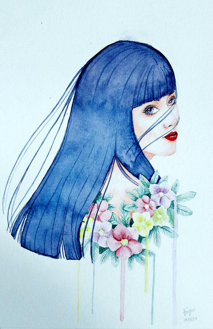 I am bad with titles, so rain of flowers............ Flowerains! GENIUS~This is an original character, I drew it with watercolours on calligraphy paper then i inked it once it had dried with Sakura Micron inkpen 005