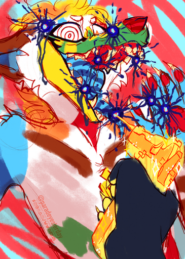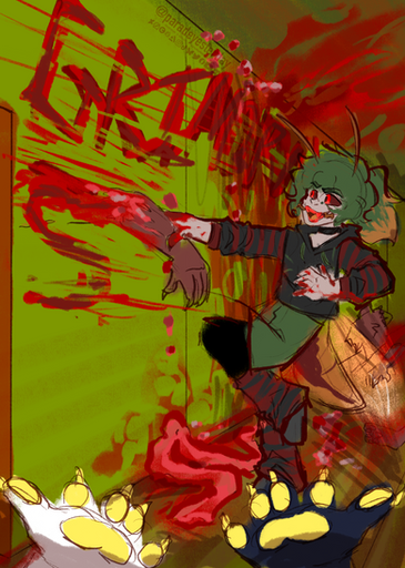 There he is. The man behind the slaughter. Cursed into agony for what he did. I love the feel of this piece and how the colours came out. I've been working on incorporating aspects of digital painting into my pieces, and so I took a slightly more abstract angle on the wall patterning behind him. I would have added posters and garbage and some clutter, but I wanted to stay true to the original picture I did from way back in 2016. He has a horrifyingly detailed design, Scott really outdid himself when he made this freak.This picture is a redraw of my very first submission to DeviantArt (on an old, now abandoned account), and well, my very first image I ever posted on the internet. I am proud to say that I've improved since then! 2016-2022. 6 years does a lot for your art! There's no better way to see how far you've come than redrawing an old piece. I'll make a journal to include the original picture in for comparison, and link it in the comments below here.