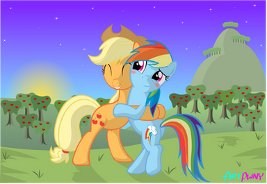 I like making stories out of pictures. HERE IT GOES!: Rainbow Dash stared lovestruck into Applejack's eyes as she excitedly jumped onto her back. She was so amazed of the beauty of Applejack's wonderful emerald eyes that she didn't even notice that applejack whispered: "Ah love you, Dashie."