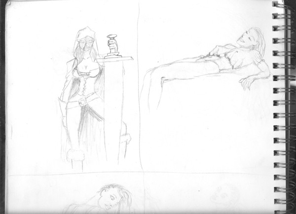 This is my first attempt at armor. The completed scene will have several knights surrounded by a bunch of demon type dudes...if I can manage to get my pencil to reflect the image in my head...but i'm sure you know how that feels. Anyway, sorry about all the other "stuff" on the page...keepin it sloppy for all my lazy peeps out there!!!ps42