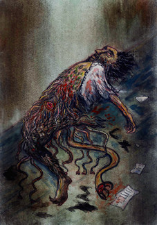 An assignment exploring the idea of virtual reality. The "virtual reality" I chose was the world of the dead. I came up with a very sketchy concept involving near-future technology enabling someone with blackmarket neural headgear to interface with the world beyond this one. One detail was that someone attempting such an interface would link up to the brain of a dead animal as a gateway into the next world. The animal would then act as either his guide or servant.I am fully aware how many movies and books I stole ideas from for this one (Flatliners, Neuromancer, and White Noise to name a few). It was a school assignment. Sue me.