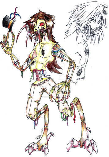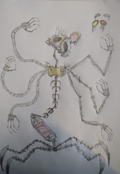 The original idea belongs to and I thought it was insanely creative so I decided to draw it!”Strangle is the name of this concept, taking in mind a quote that comes from Mangle in UCN somewhat, a employee during the night shift (likely a night guard or janitor) gets stuffed into a mangled springlock suit of the obscure character Tangle (A enemy from FNAF World) but the problem is of course the suit in how it's all broken, so the spring lock failure results in the person within having their guts and what not strayed among the endoskeleton, the main feature is of course the ripped open corpse within, pulled apart from the manner of which the animatronic was broken which looks as though it had been it bent from a blunt object. Strangle would be adopted by a bunch of teens also making a cobbled together horror attraction, dubbing Strangle his name due to a myth made, claiming that it'd wrap around your neck and use its springlocks to snap your head clean off.”