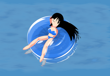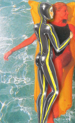 This drawing was based on a Pupett photoshoot. Inflated ball hooded rubbergirl with inflated rubber tits, on an inflated rubber toy floating in her pool....