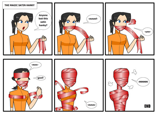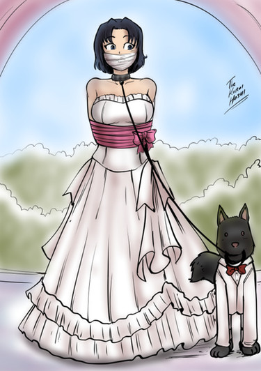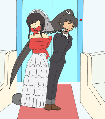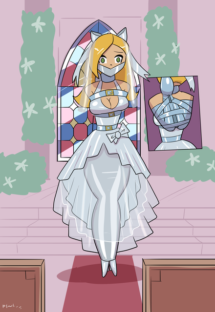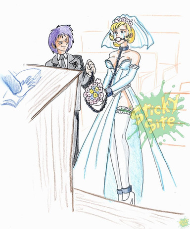 Jason dressed up as a bride, he's also given a wig/hair extensions and breast forms so he fits the part better, also he's tied up, but in a way that's hidden by the dress/other accessories.