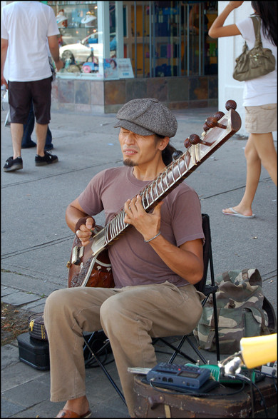 Subjects: Jerry (guitar) and Mona (recorder)Jerry is a street performer in Toronto and a damn fine guitarist. He used to play around Yonge st. but has since moved to Queen West to stay out of the sun. He's an odd guy...bright red with sunburn, hair as white as paper and bright blue eyes. And Mona is...Mona. One of my dearest friends.