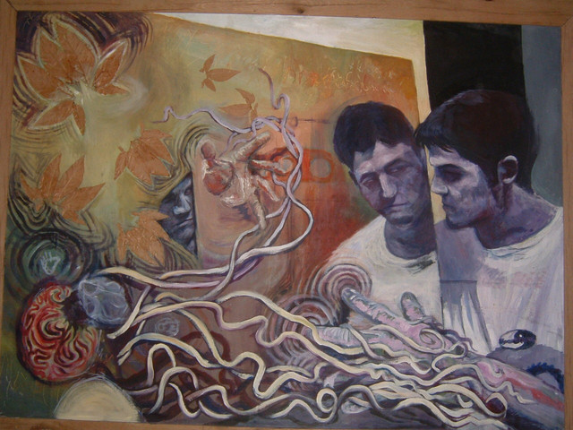 90 x 90 cm acrylics and oils on canvasThe face belong to Mark Landis. In the documentary Art and Craft they tell this guy's story. For decades he's been forging obscure old artworks. He then donates the pieces to museums pretending to have obtained them through inheritance.