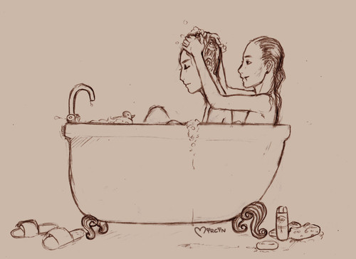 I so so so so much loooove this drawing! It reminds me of my husband and me (though we do not look like this, and we do not have such a big bathroom and no buthtub ...).