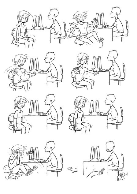 Been there. Yesterday, as a matter of fact. I didn't knock things over, but I did jump high enough to clear my chair. I condole with you.