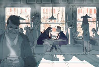 I love the color scheme you used--lots of warm tones and shades of gold. The little details of the food on the table are lovely. I can't decide if the people are having a deep conversation or just enjoying each other's company, haha.